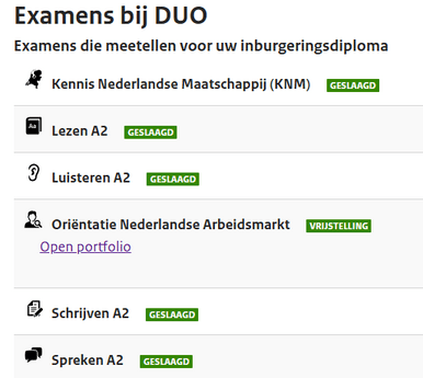 | 6. Orientation to the Dutch Labour Market (Oriëntatie Nederlandse Arbeidsmarkt) | The exam is in two parts: 1) You make up a file about yourself, in which you describe your talents and the things you can do. You also describe the kind of work you would like to do, now and in a few years’ time. We call this file a ‘portfolio’. 2) Your portfolio will be checked by an examiner. If the examiner is satisfied, you will be invited to an interview. At the interview, you and the examiner will talk about your portfolio. |